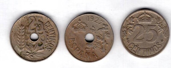 Spain, 25 Centimos, 1925, 1927 & 1934. dy16109