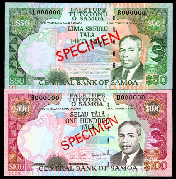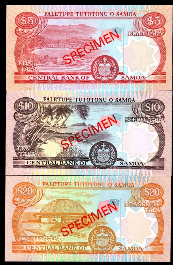 Samoa, Central Bank, 5-100 tala (5 notes) (2002) Specimens (WPM 33s-37s). Set number; 0325