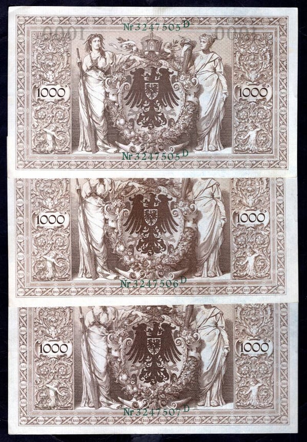 Germany, 3, consecutive, 1,000 Mark 21-4-1910 (WPM 45b). 3247505-07D. VF-EF.