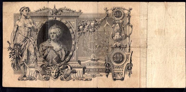 100 Roubles, a few small holes, edge nicks and tears up to approx; 7mm, small repair top left. Fine.
