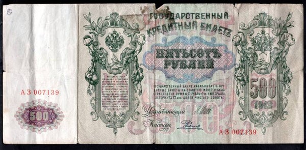 500 Roubles, Annotation top left corner, pinhole, edge nicks and tears up to approx; 13mm, Large tear at top, down and
