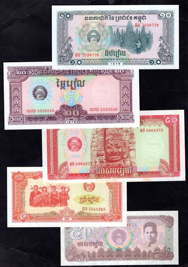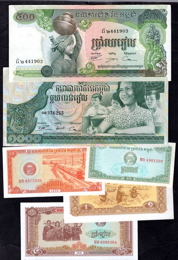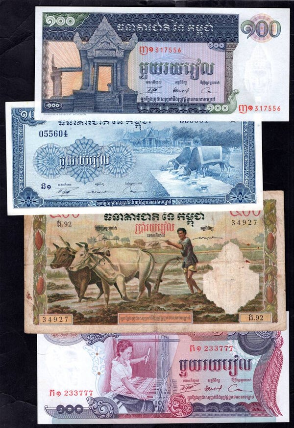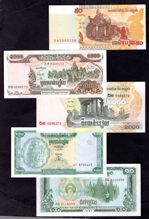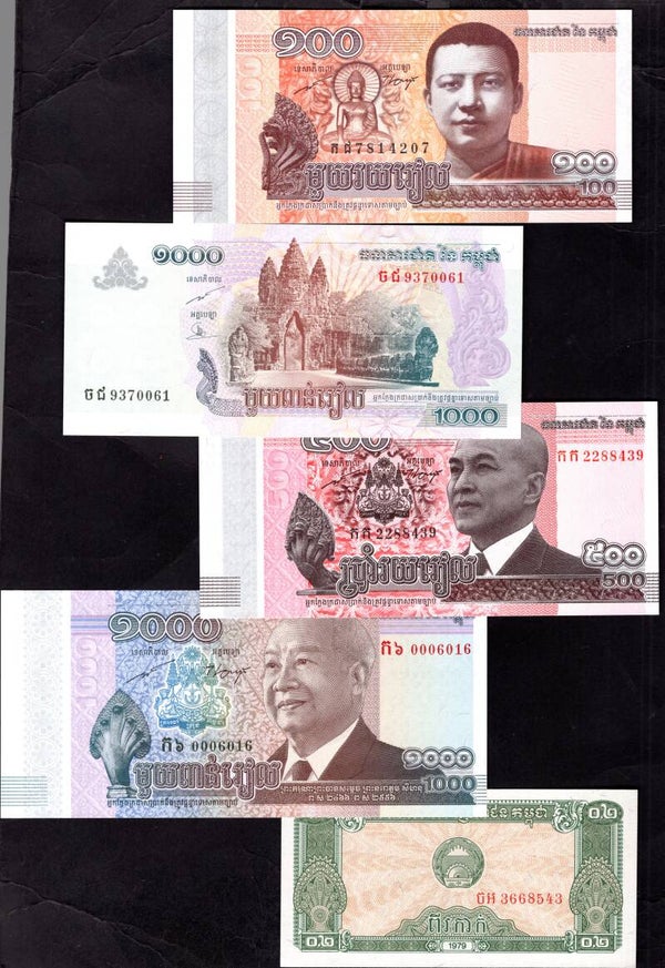 Vast majority UNC or AU, including 100 Riels 664675 (blue and gold) which has small spot on right margin.