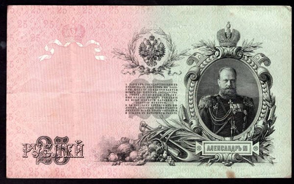 Russia, 25 Roubles, 1909, Shipov Signature, 709989, Crisp F-VF.