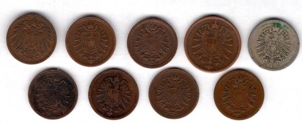 Germany, 9 coins, better dates/mint marks. DY148665 Pfennig 1876H.2 Pfennig 1874E.1 Pfennig, 1874B, 1874C (2), 1876B, 1876C, 1887F, 1901J.