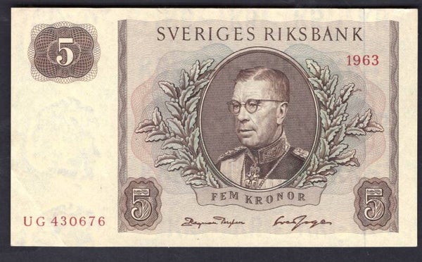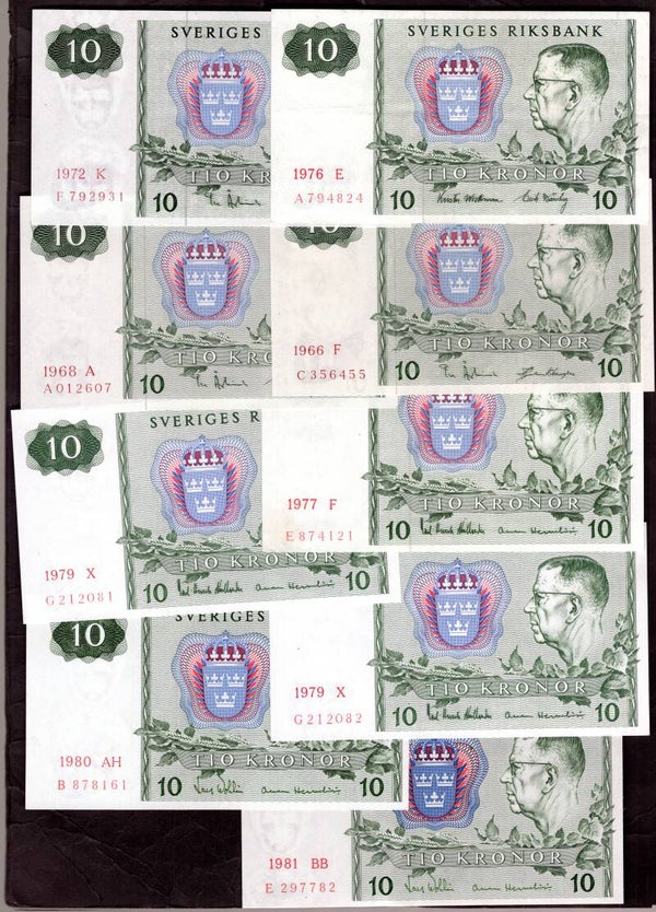 Sweden. 22 notes. DY16877.5 Kronor x 12. Average AU.10 Kronor x 9. 5 average AU-UNC, the other Four are Fine to EF.5 Kronor 1963 Pressing VF.
