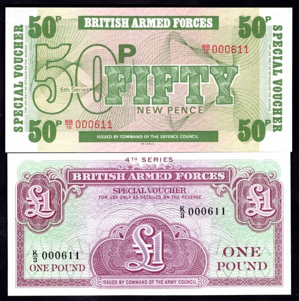 GB Military, British Armed Forces, 7 notes matching numbers 000611. UNC.