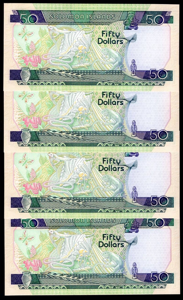 Solomon Islands, $50 (1997) First series, 4 consec C/1 000705-708. Very slight denting. AU-UNC.