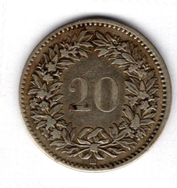 Switzerland. 20 Rappen 1850BB. Cleaned.