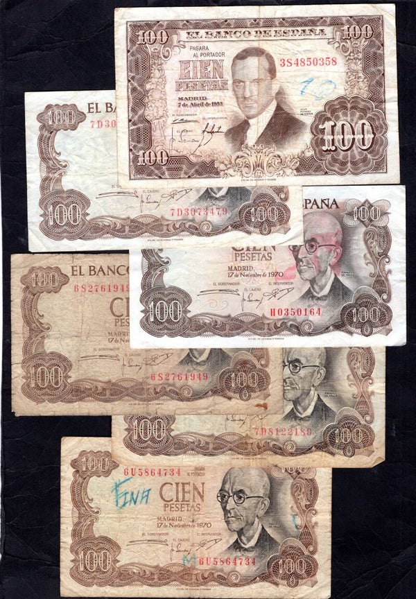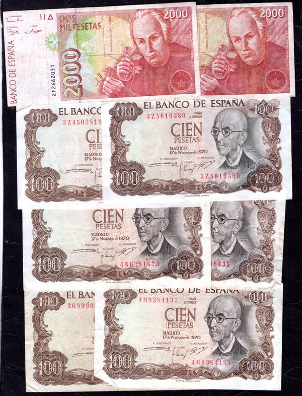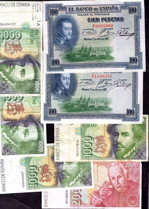 Small holes, edge nicks, pinholes, pressing, ink annotation, spotting/staining, 500 Pesetas has tape "repair".