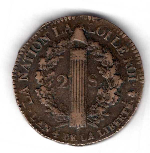 France. Louis XVI. 2 Sols 1792A. Edge chip on reverse, about Eleven O'Clock. DY18959