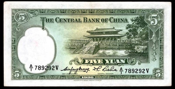 China. Central Bank. Five Yuan 1936 (WPM 217a) A/I 789292V