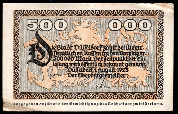 Germany. Dusseldorf. 500,000 Mark 1-8-1923 156506 GVF+. DY20543
