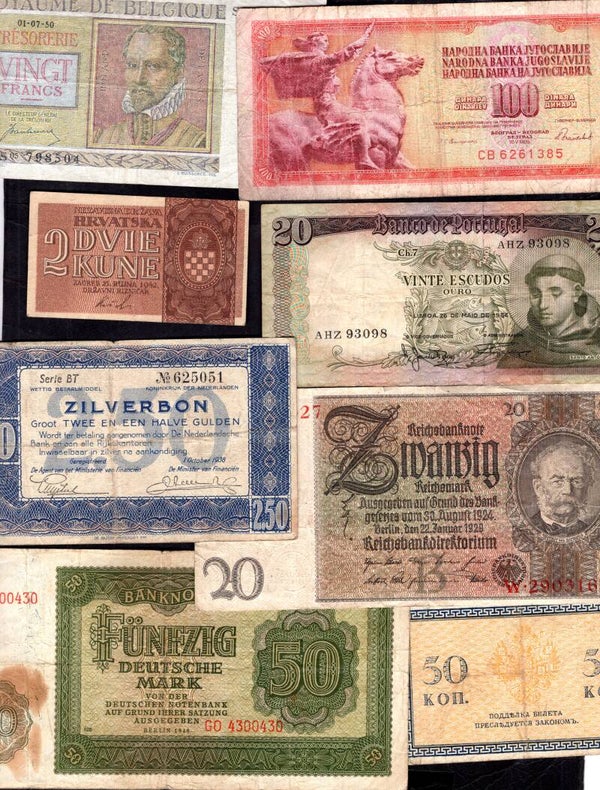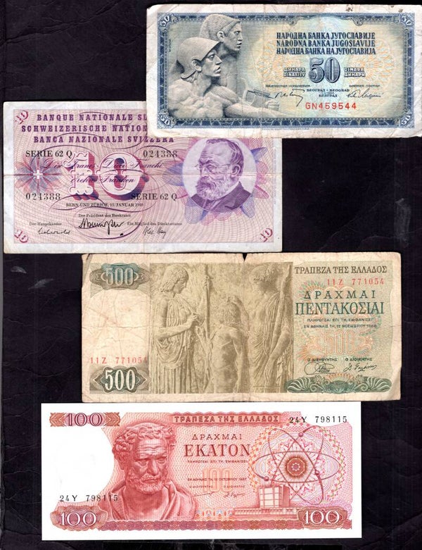 Faults include; Ink and pencil annotation, holes, edge nicks, tears - longest on Blue Greek 100 Drachma, up to approx; 2 Centimetres, staining, pressing. DY20564