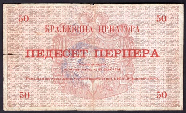 Montenegro. 50 Perpera 1914 (WPM 20) 00010425.Small nick out of top margin, pressed, large tear at right, approx; 25mm.Good Fine. dy21029