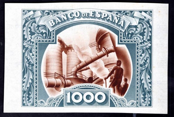 Spain, 1,000 Pesetas, 1-1-1937 (WPM S567) watermarked AU+. Uneven margins, slight staining, slight denting. DY20930