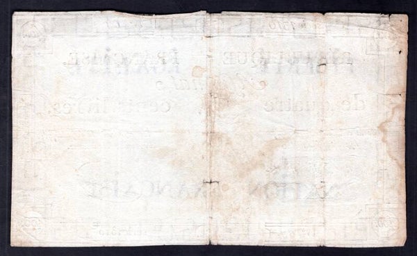 France, 400 Livres, 1792 (WPM A73) series 1310, Tridon signature.Small holes, edge nicks, pressed, 8mm tear left side. Nearly Fine.