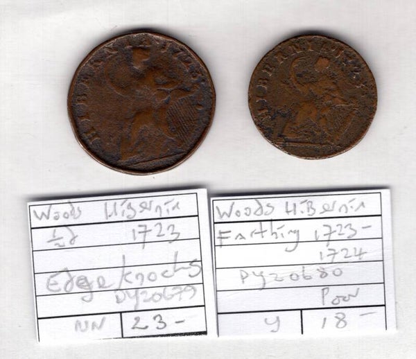 USA, Hibernia Woods Farthing and Halfpenny, edge knocks, corrosion, 1720s. DY20679