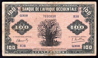 French West Africa. 100 Francs (WPM 31a). 7690838 Fine. DY20220
