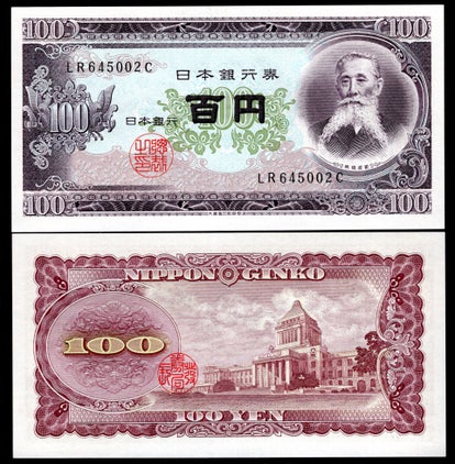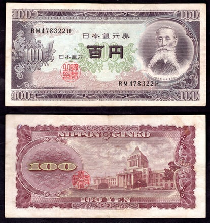 100 Yen 1953 series LR---C slight denting and creasing AU+ dy16040