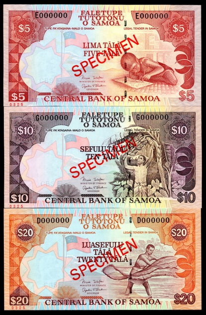 Samoa, Central Bank, 2-100 tala (6 notes) includes $50 without serial numbers.