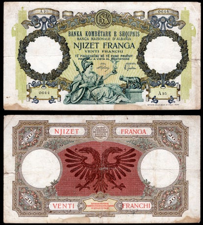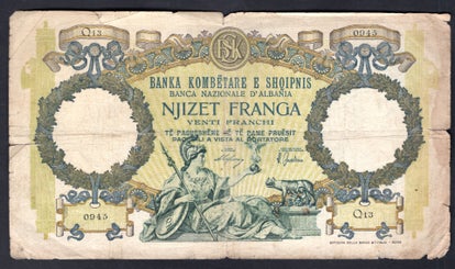 Albania, 20 franga (1939), Q13 0945 (WPM 7). VG.