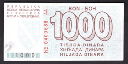 Bosnia-Herzegovia. Siege of Sarajevo 1,000 Dinara 1992 (WPM 26a). AA 0400688