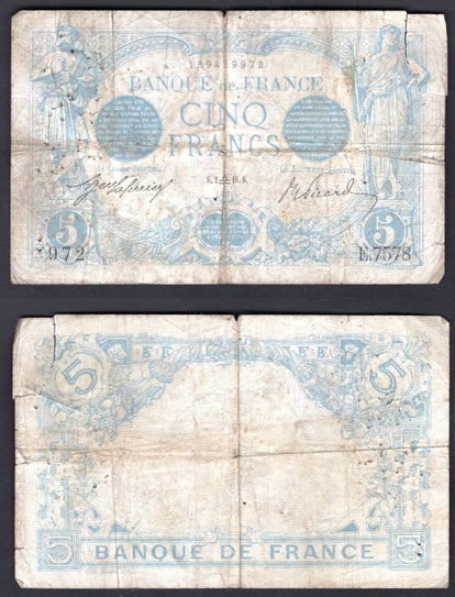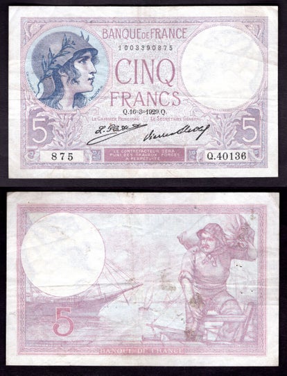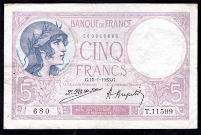 France, 5 Francs, 10-3-1923, 308721207. Pinholes. Crisp Fine. MV11668