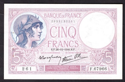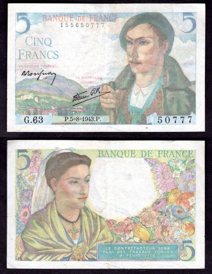 5 Francs 5-4-1945 no pinholes vrisp VF dy22070