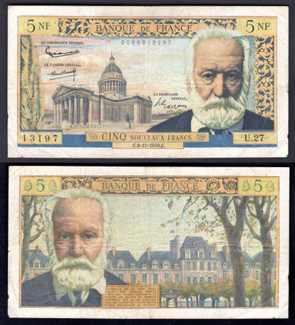 5 New Francs 3-12-1959 pinholes, pressed, a few edge nicks, Crisp F-VF. dy20880