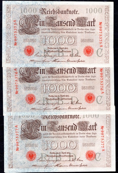 Germany. 1,000 Mark, 1910 consecutive trio. 9975375-77.