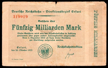 Germany. Reichsbahn Erfurt. 50 Milliarden Mark 20-10-1923 319919 Edge nicks and tears up to approx; 12mm, 3 pinholes including 1 enlarged. GF+. DY20169