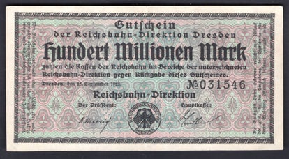 Germany. Reichsbahn Dresden. 100 Million Mark 25-9-1923 (WPM S1177) 031546 GVF+. DY20199