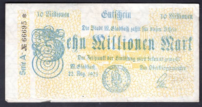 Germany. Munchen Gladbach. Ten Million Mark 22 Aug 1923 A66695 A few edge nicks and tears up to 4mm, pinhole. Crisp VF.