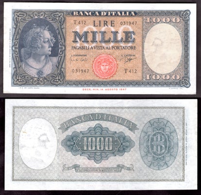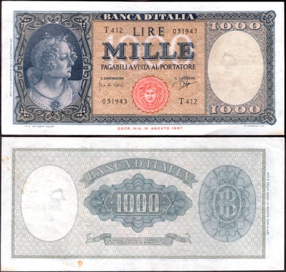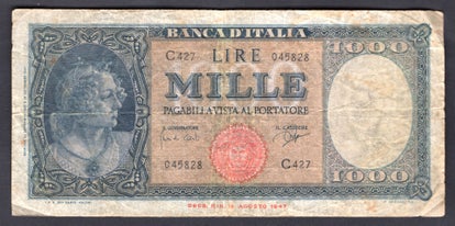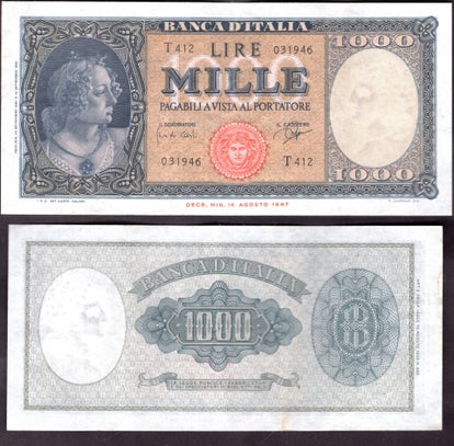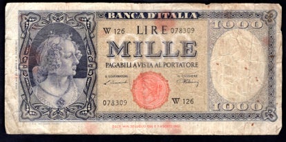 Italy, 1,000 Lire, 1947, Replacement (WPM 82). W126 078309.