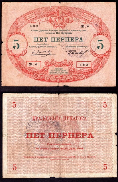 Montenegro. 5 Perpera (1916) with overprint No 15742. VG. dy21014