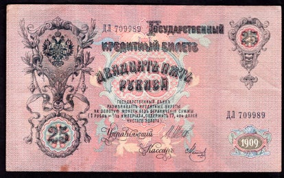 Russia, 25 Roubles, 1909, Shipov Signature, 709989,