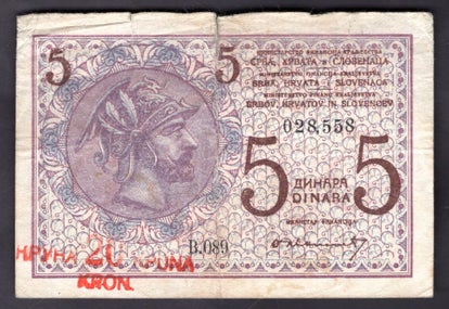 Yugoslavia. 5 Dinara/20 Kron C.1920s Fine.