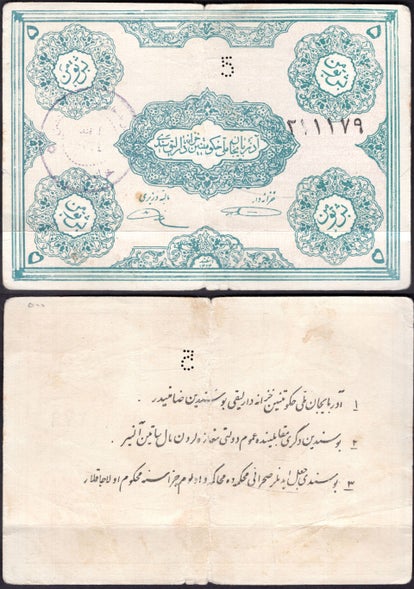 Azerbaijan. Five Tomans (1946) (WPM S104a). 211179 F-VF.