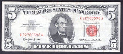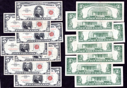 (TP) USA. Red Seal. 7 x $5 series 1963. Good Fine average. DY20873