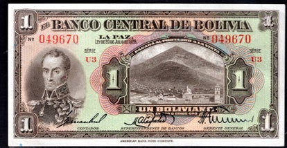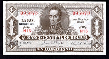 Bolivia, 1 Boliviano, 20-7-1928 (Issued 1952), N16 095673.