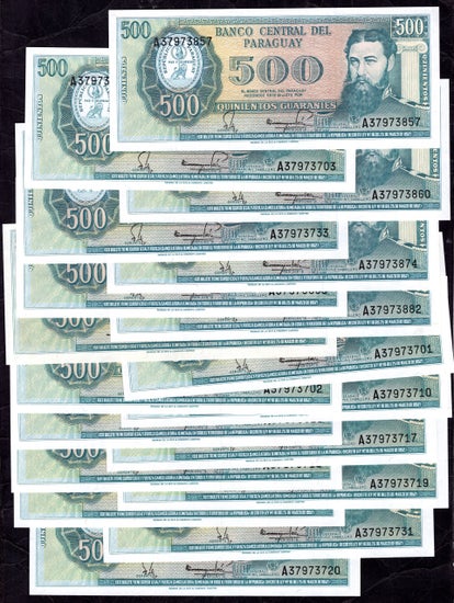 Paraguay, 10 x 500 Guaranies consecutive A37973754-763. UNC.